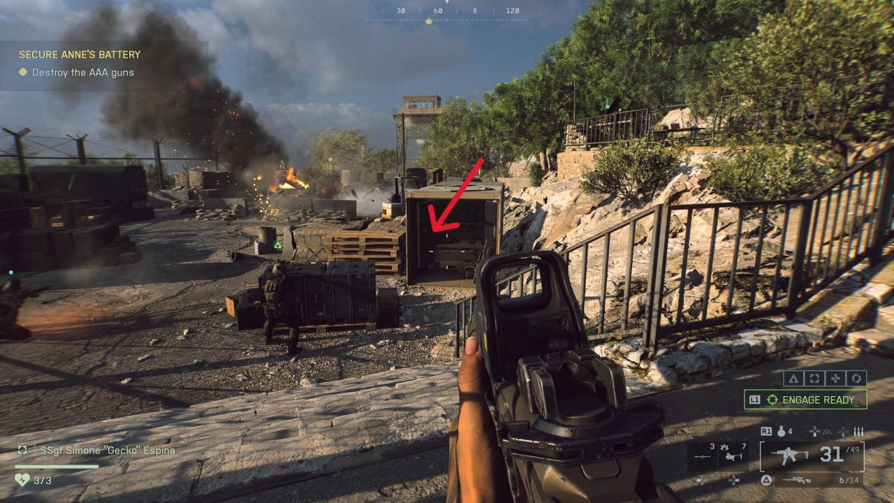 l Dog Tag 1 (Gino Galli): After the initial tank section, you're told to "link up with the armored vehicle." Ignore the vehicle and climb the stairs to the left (previously held by snipers). The tag is behind these stairs on a crate.