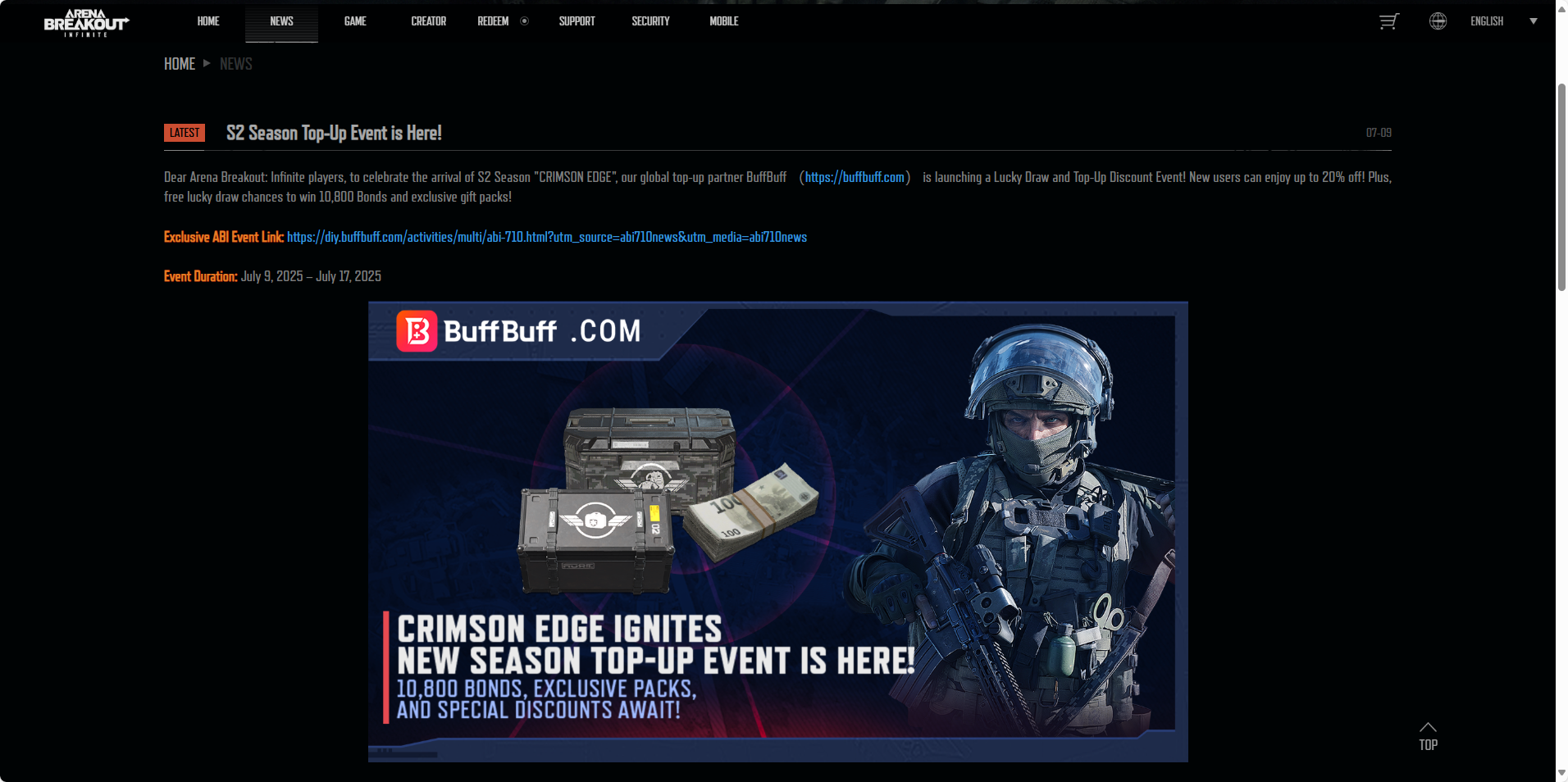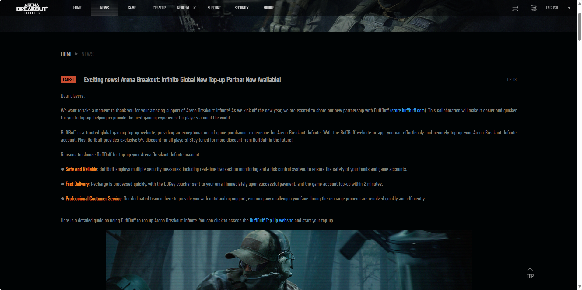 On the official website of Arena Breakout: Infinite, several articles have been published in partnership with BuffBuff, clearly stating that BuffBuff is an officially authorized top-up platform.