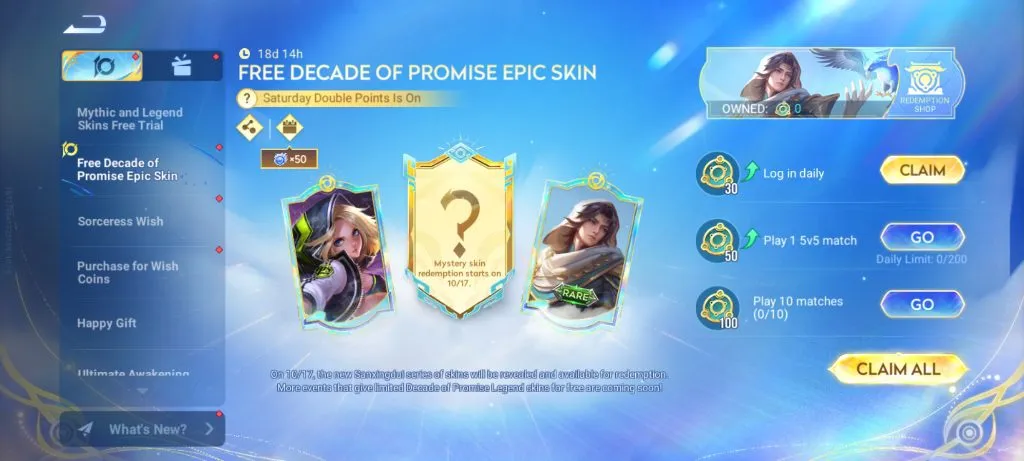 The process to unlock the free Decade of Promise Epic Skin revolves around completing missions to earn points, which you can then exchange for the skin and other rewards. The best part? You can earn double points every Saturday to speed up your progress.