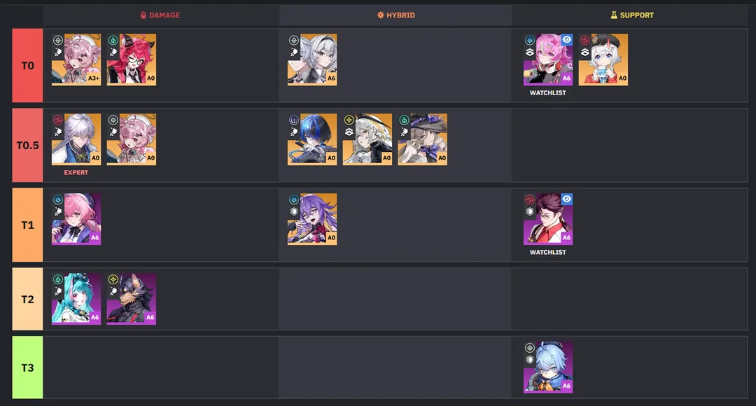 - T0/S+ Tier: Meta-defining characters with top-tier DPS, support, or hybrid utility