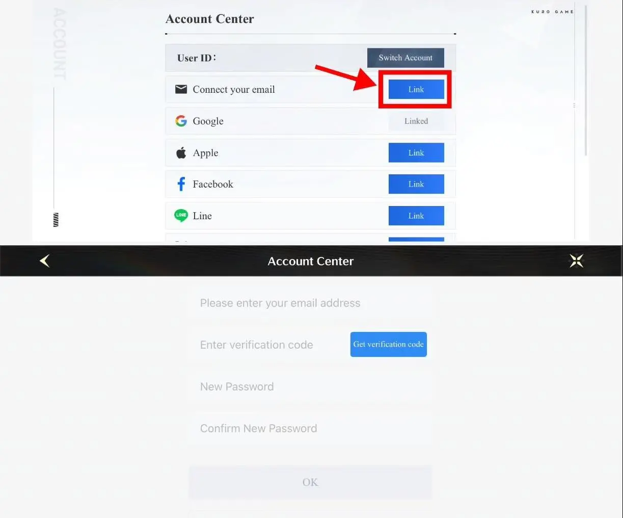 Top-up hanya mendukung akun KURO GAMES. Hubungkan akun pihak ketiga (Google/Facebook/X) ke KURO GAMES terlebih dahulu.