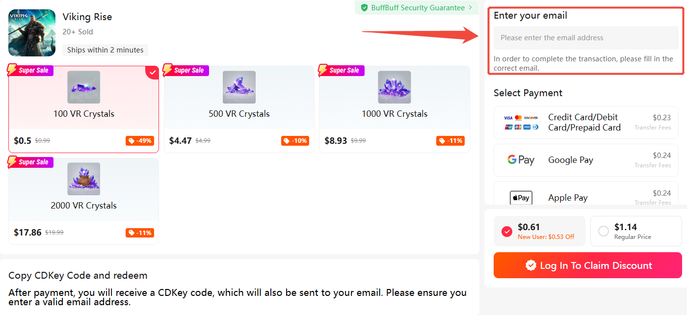 Os Chefes inteligentes economizam tempo fazendo uma recarga de Viking Rise na BuffBuff. Basta selecionar o pacote de Cristais desejado, inserir seu ID de Usuário e concluir o pagamento. Nós enviamos os Cristais diretamente para sua conta para que você volte à batalha imediatamente.