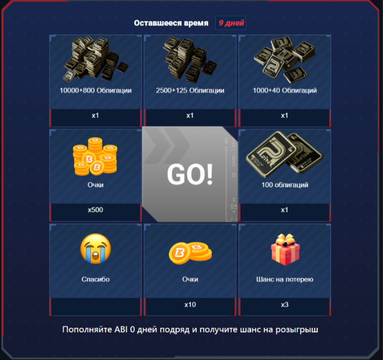 - Бесплатная лотерея: Каждый получает 1 бесплатную попытку! Выполняйте задания и пополняйте счёт, чтобы получить больше шансов. Выигрывайте потрясающие призы, такие как 10 800 Облигаций, 2 625 Облигаций, $5 (500 очков) и другие!