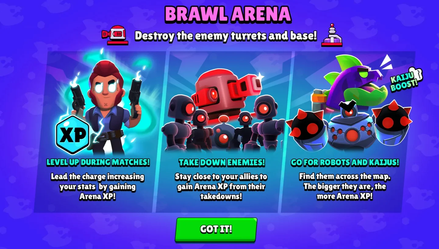 Brawl Arena — это новый захватывающий способ играть в Brawl Stars. Этот игровой режим, доступный во время сезона Crush the Kaiju, имеет все особенности, которые вы ожидаете от MOBA: армии ботов, джанглинг, продвижение по уровням, вражеские башни и хаотичные действия.