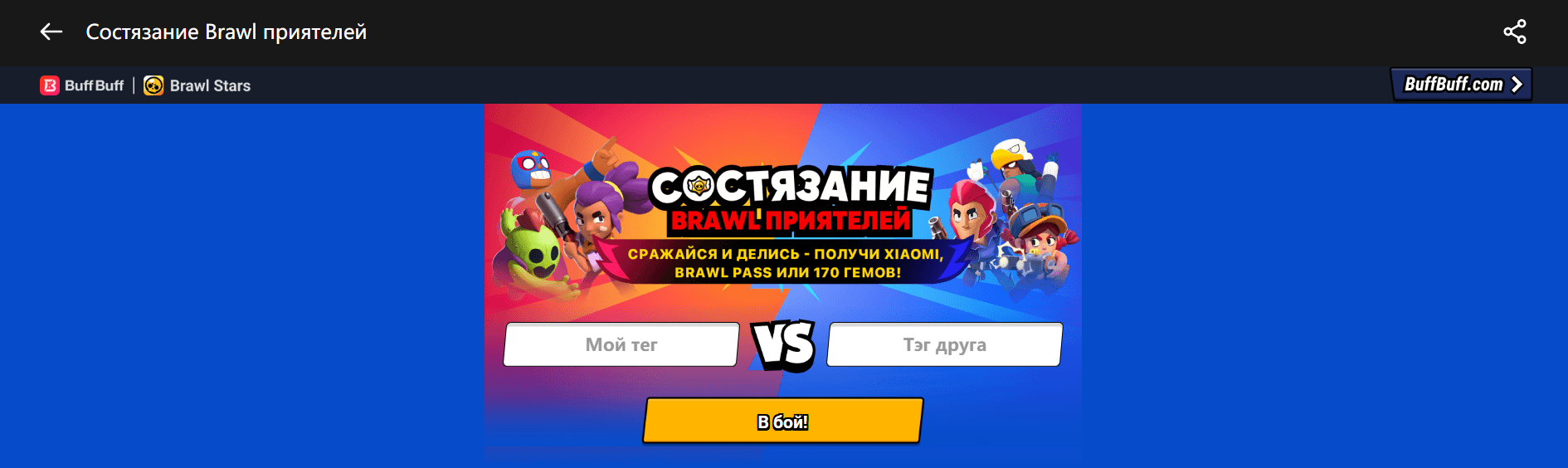 Чтобы отпраздновать обновление Brawl Stars, Buff проводит эксклюзивное событие! Объединяйся с друзьями и сражайся в матчах или дуэлях 1 на 1. Проверь, кто доминирует в твоей дружеской группе Brawl Stars!