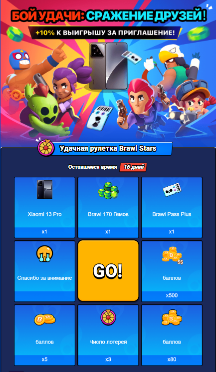 Угадай что? У нас есть бонус! Ты можешь получить дополнительные шансы в нашем розыгрыше! Тебя ждут потрясающие призы в игре — от самоцветов и Brawl Pass Plus до Xiaomi 13 Pro и многое другое!