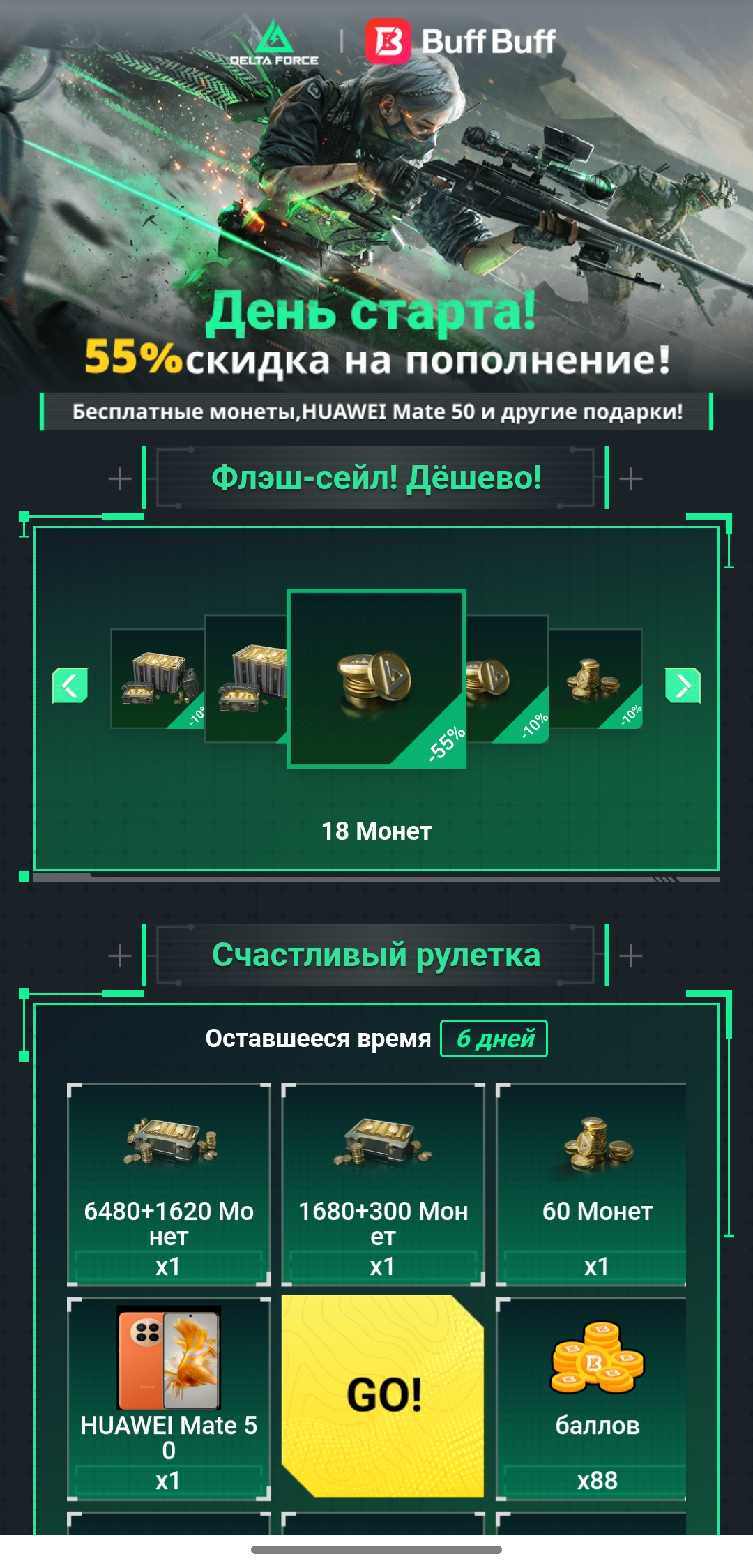 Получите скидку до 55% при пополнении счета Delta Force Mobile на BuffBuff! Присоединяйтесь к розыгрышу и выиграйте: 6820 жетонов、полный комплект снаряжения (класс 5)、675 жетонов и множество других крутых призов!