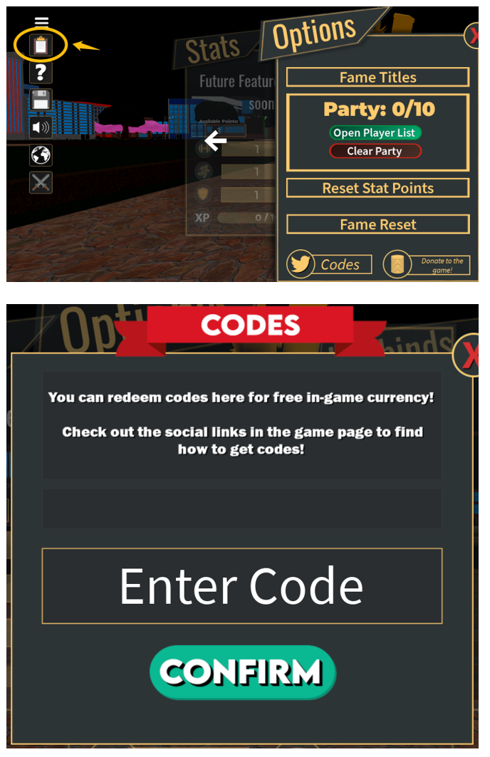 5. Прокрутите вниз, нажмите "Codes" и введите код Boku No Roblox.