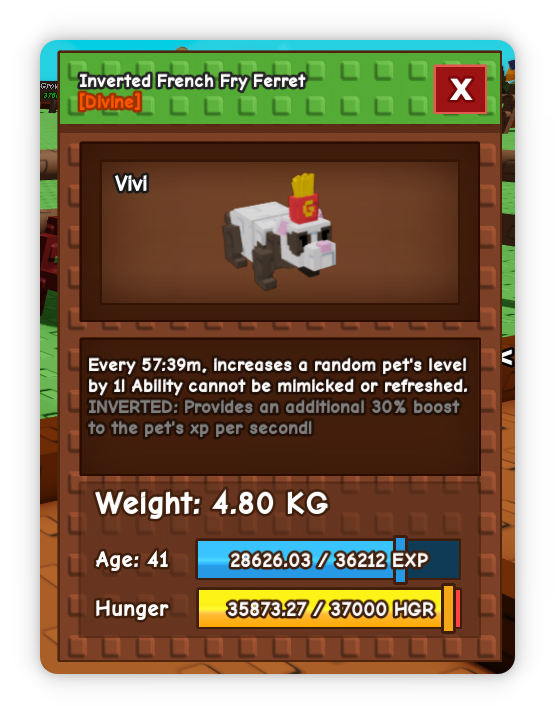 | Уникальная способность | «Дружелюбный фритюрщик»: повышает уровень случайного питомца на 1 каждые 20–60 минут; не может быть скопирована или обновлена |
