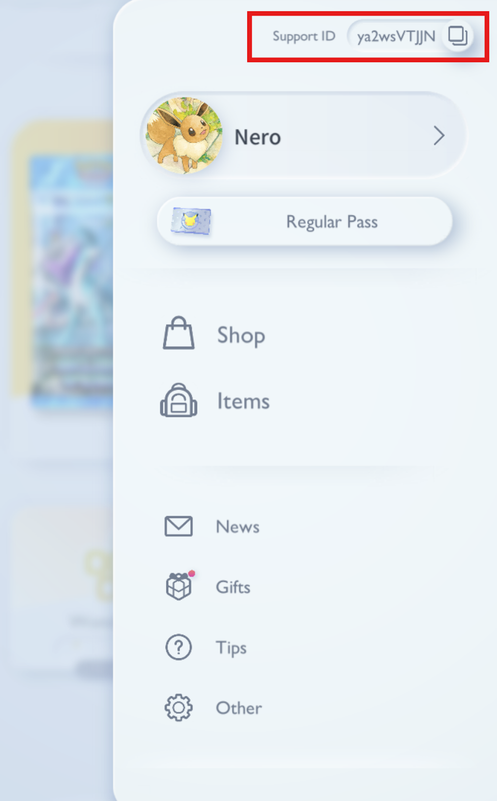 Шаг 4: В верхней части всплывающего меню вы увидите поле «Support ID» (Идентификатор поддержки), за которым следует строка символов; это ваш UID-идентификатор учетной записи Pokémon TCG Pocket. ![]()