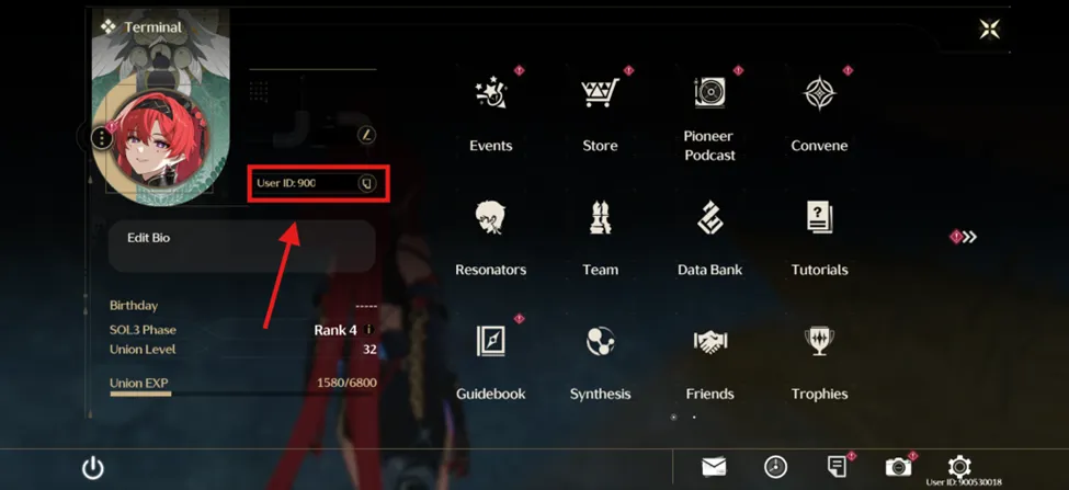 Шаг 5: В левой части страницы «Терминал» вы увидите свое имя пользователя и идентификатор пользователя. Длинный номер, отображаемый здесь, является вашим UID Wuthering Waves.