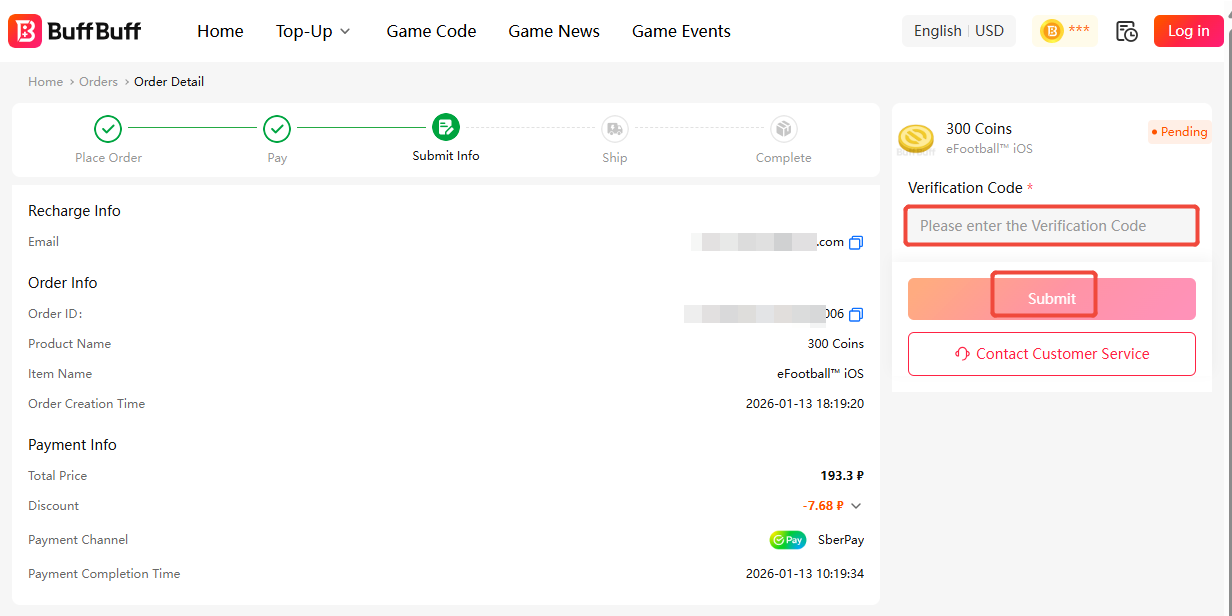 5. Promptly enter and submit required info on the order details page (e.g., verification code).