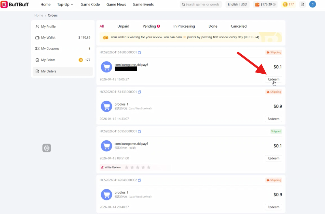 Step 1: Once payment is complete, go to the "Orders" page and click "Redeem." Then, click the pop-up dialog box and select "Enter Now."