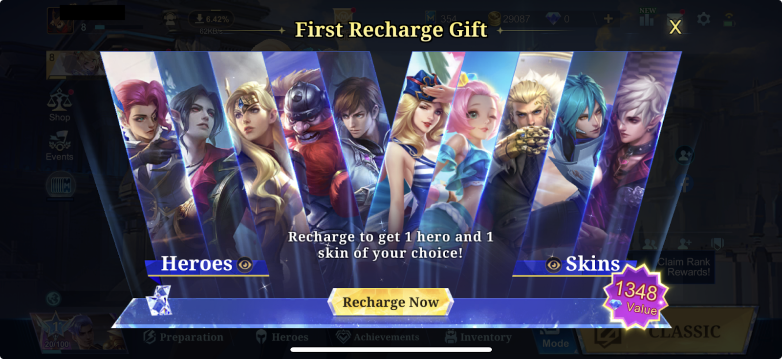 Note: The First Recharge Gift and first-time top up double bonuses may only be available in select regions. Please check in-game to see if you are eligible for the mentioned bonuses.