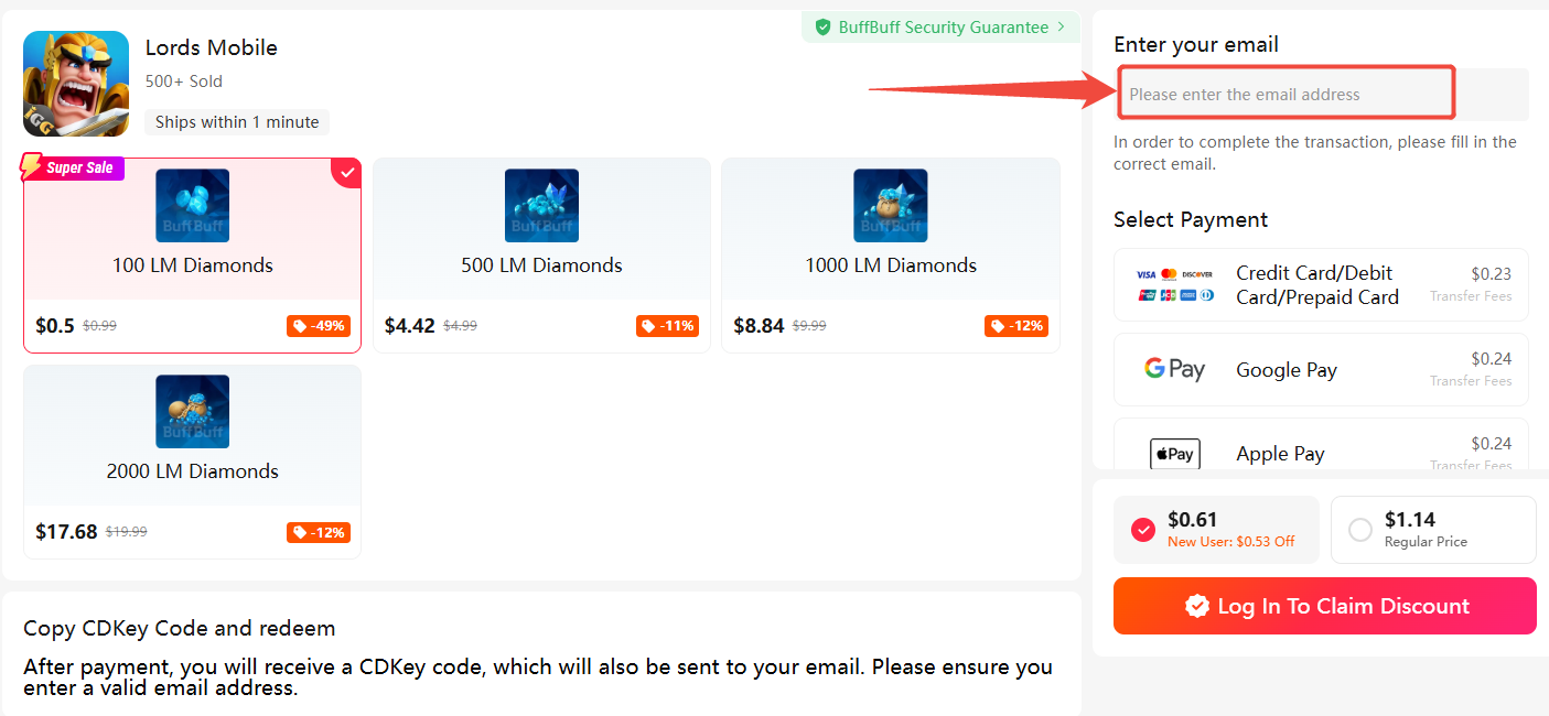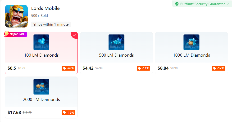 聰明的領主會選擇直接在 BuffBuff上儲值以確保鑽石供應。只需選擇套餐、輸入 IGG ID 並完成付款,我們便會將鑽石直接發送至您的帳戶,讓您能立即返回遊戲世界。